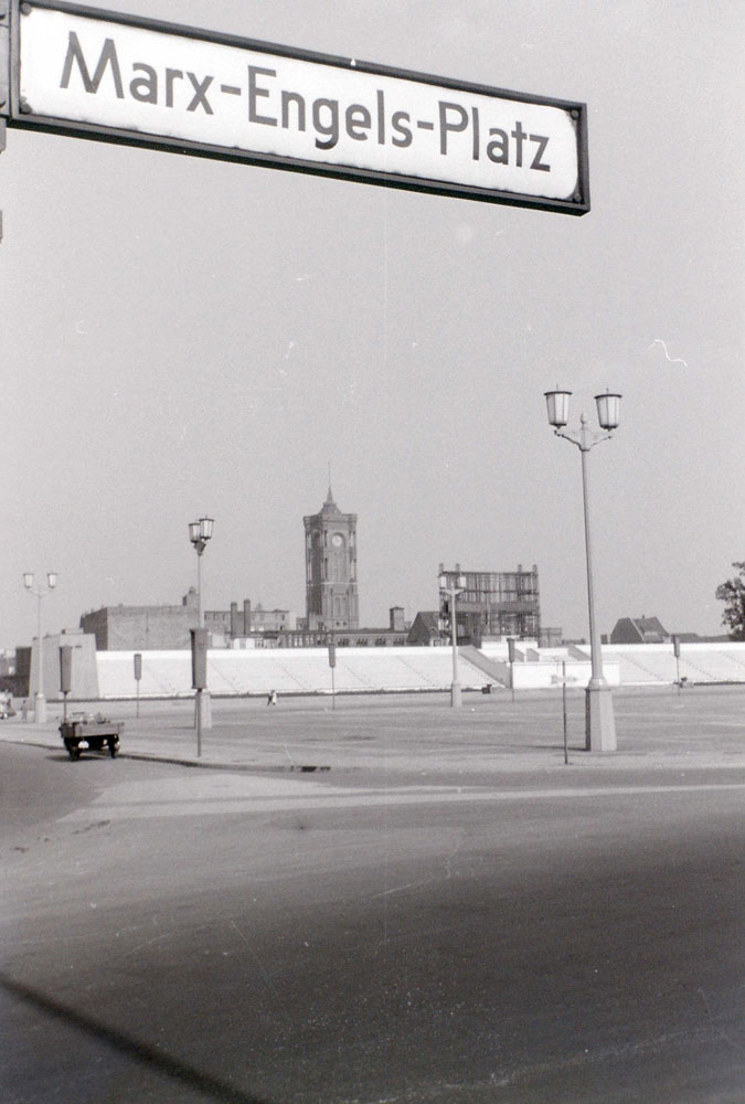 I’ve spent some time exploring the city; am staying in a small Pension a short distance from the famous Kurfürstendamm, which is a kind of Oxford Street. Yesterday I walked along this street, and along as far as the edge of the Soviet sector of the city, past the Brandenburg Tor (Marble Arch!) into the Soviet Zone down the Unter den Linden (the Mall!) to Marx Engels Platz, which is a bare waste of concrete with a platform at one end.