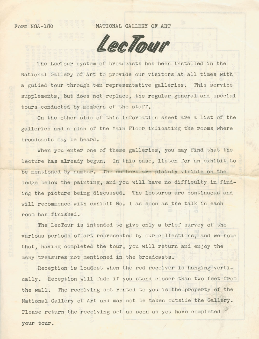 On the Sunday explored the city on foot, and spent some time in the National Art Gallery. Found an ingenious “guide” system there. Certain galleries were wired for a special kind of radio reception. One borrowed a device consisting of a small loudspeaker which one fitted over one’s ear-hole(!) and a battery and aerial which hung down from one’s neck. On entering a gallery wired for the performance, a commentary on the paintings was spoken directly into one’s ear. It was being continuously recorded, so that if one entered when the commentator had got round to no. 5 he would mention this painting by number during his discourse and then go to the next one, then to the end, and start again at no. 1. No two galleries next to one another were so wired, presumably to exclude interference.
