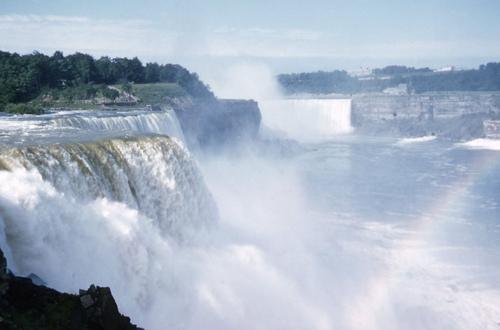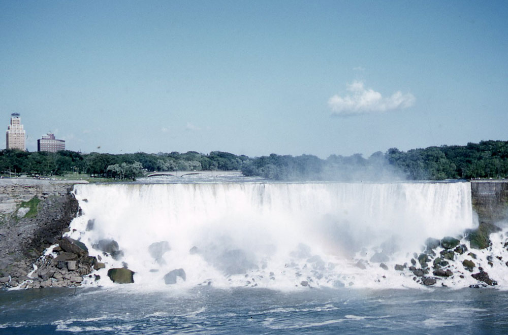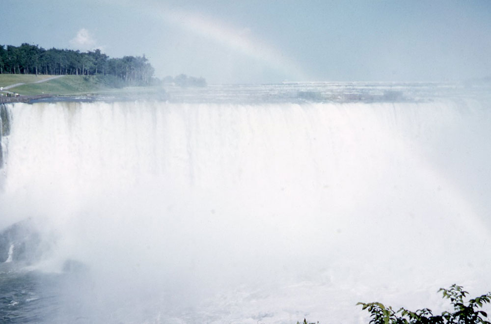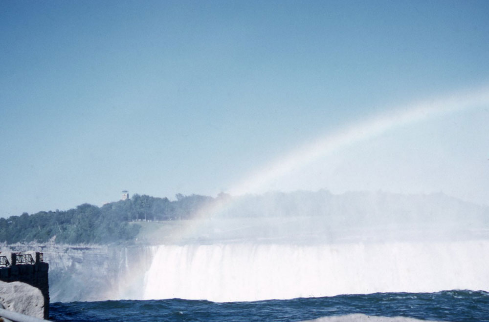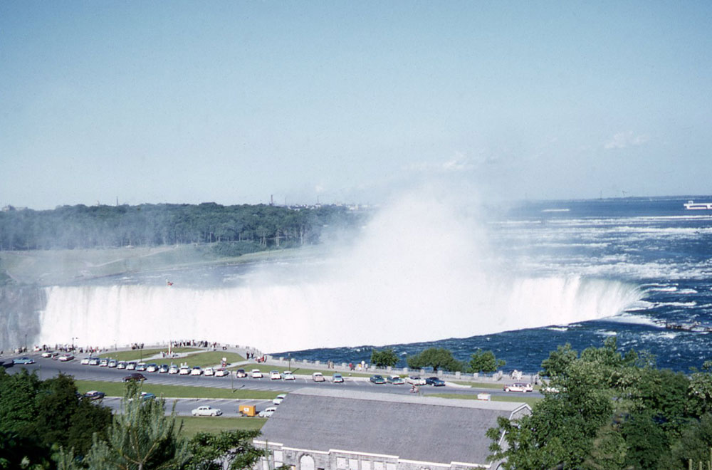 On the way [to Niagara Falls], part of the busy town of Buffalo is by-passed by a “skyway”, where the road is carried over the top of the town. Niagara was really magnificent. The sun was shining fairly strongly, and I took some colour transparencies of the Falls with bright rainbows in the spray. Hope they come out all right! At night the Falls were floodlit in vile green and crimson light.