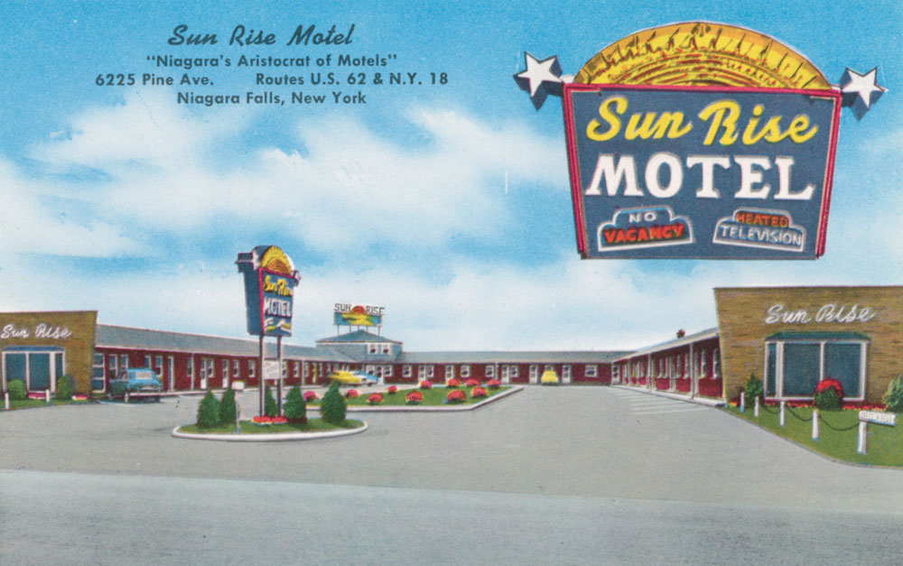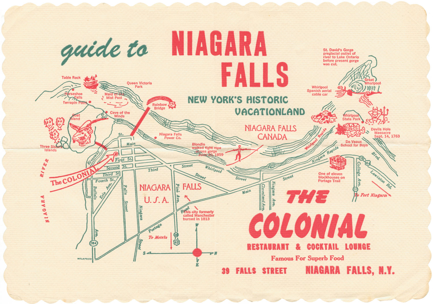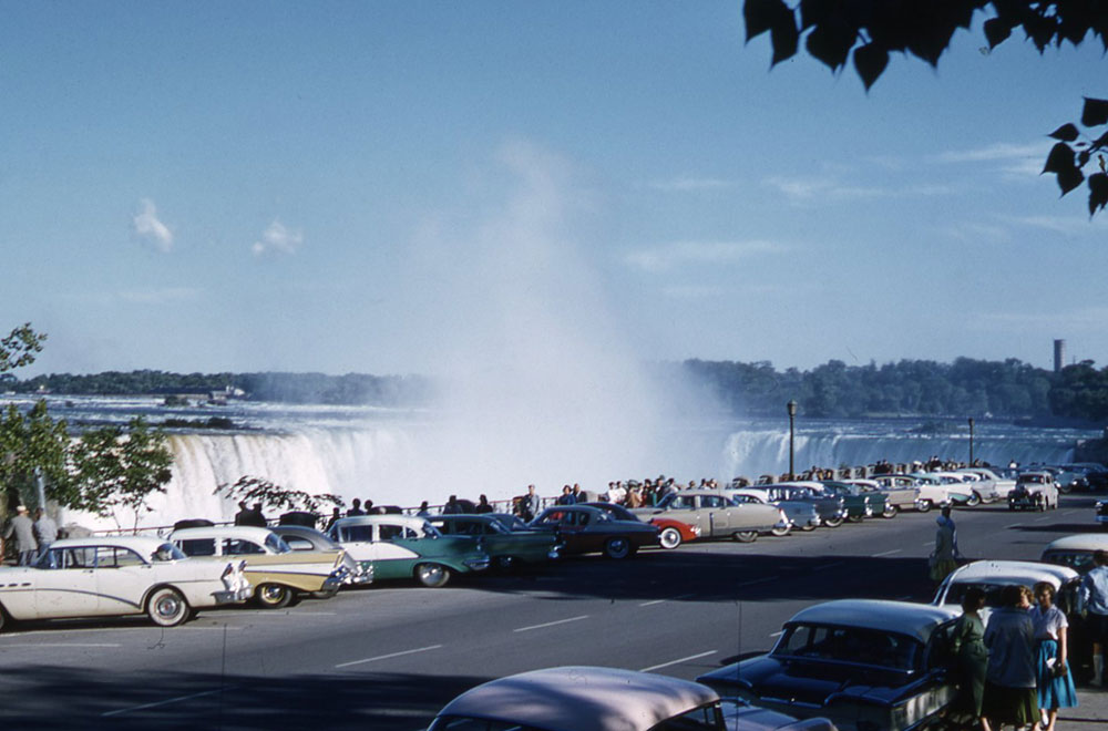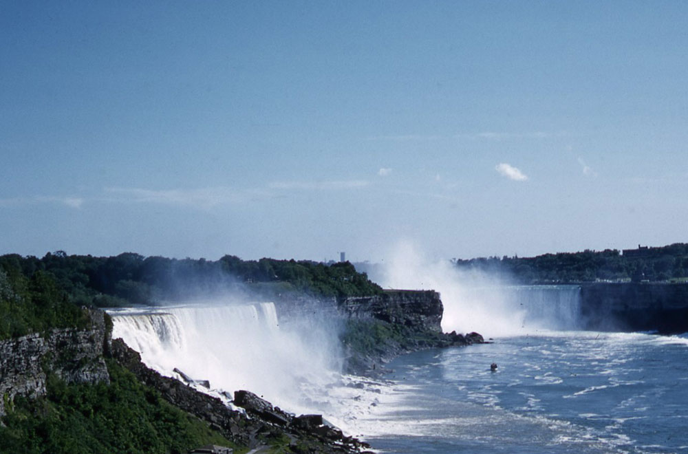 On the way [to Niagara Falls], part of the busy town of Buffalo is by-passed by a “skyway”, where the road is carried over the top of the town. Niagara was really magnificent. The sun was shining fairly strongly, and I took some colour transparencies of the Falls with bright rainbows in the spray. Hope they come out all right! At night the Falls were floodlit in vile green and crimson light.