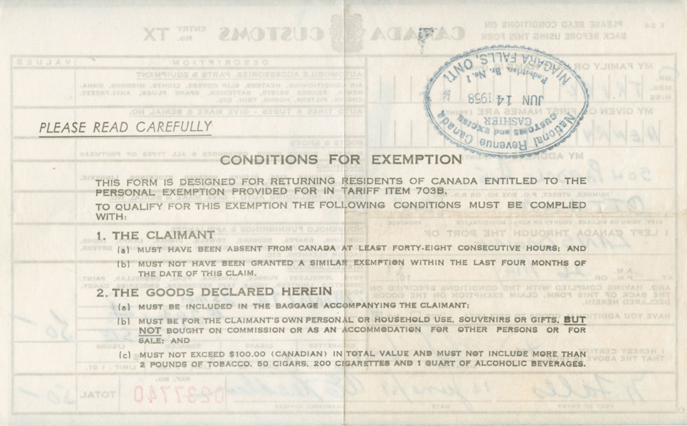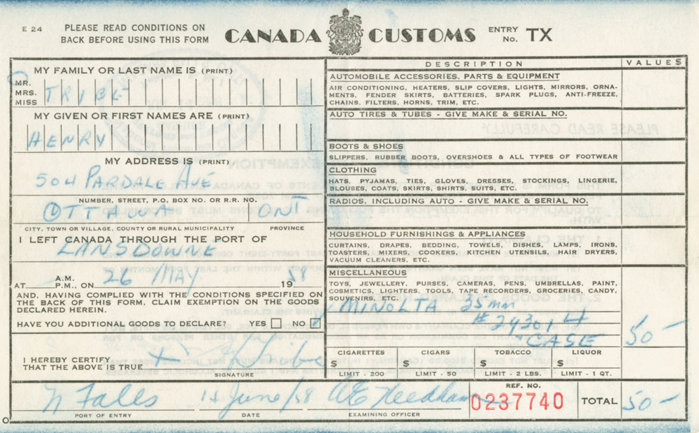At Niagara Falls, Henry crossed the border back into Canada. Below is the customs declaration for the Minolta Camera he bought in New Brunswick: