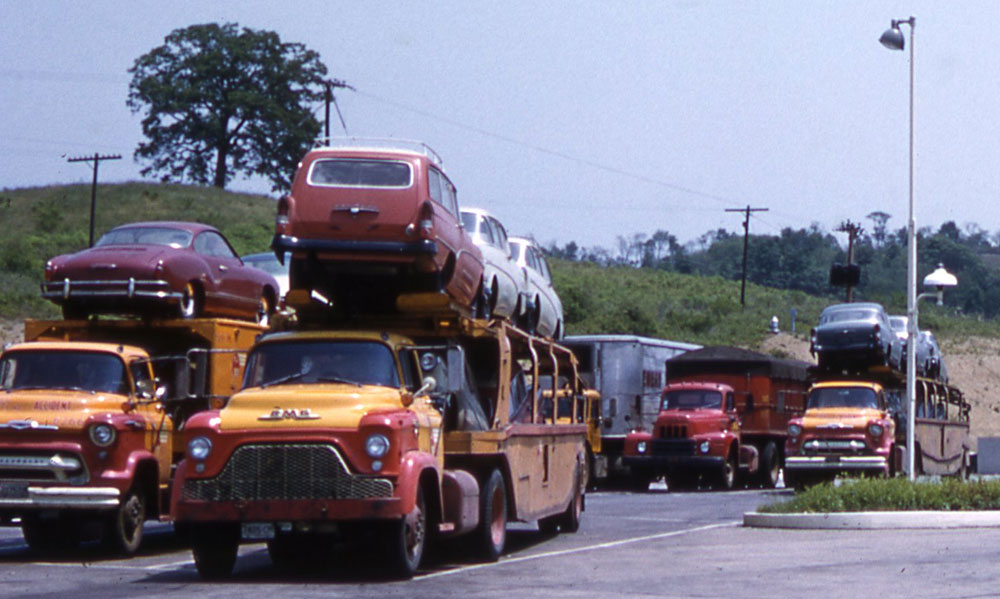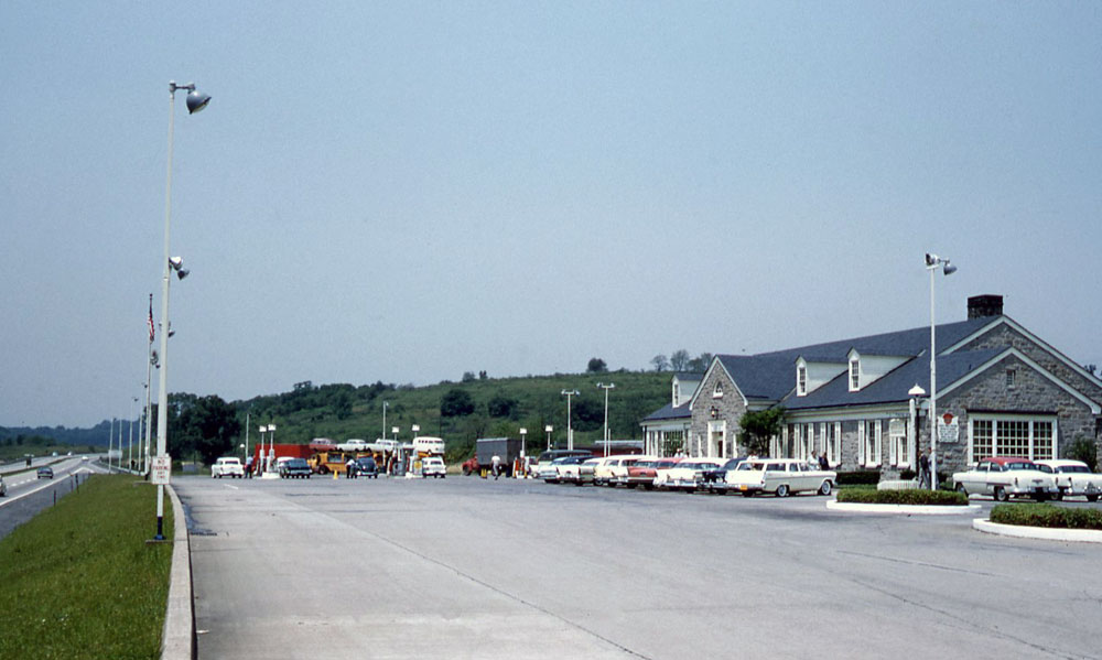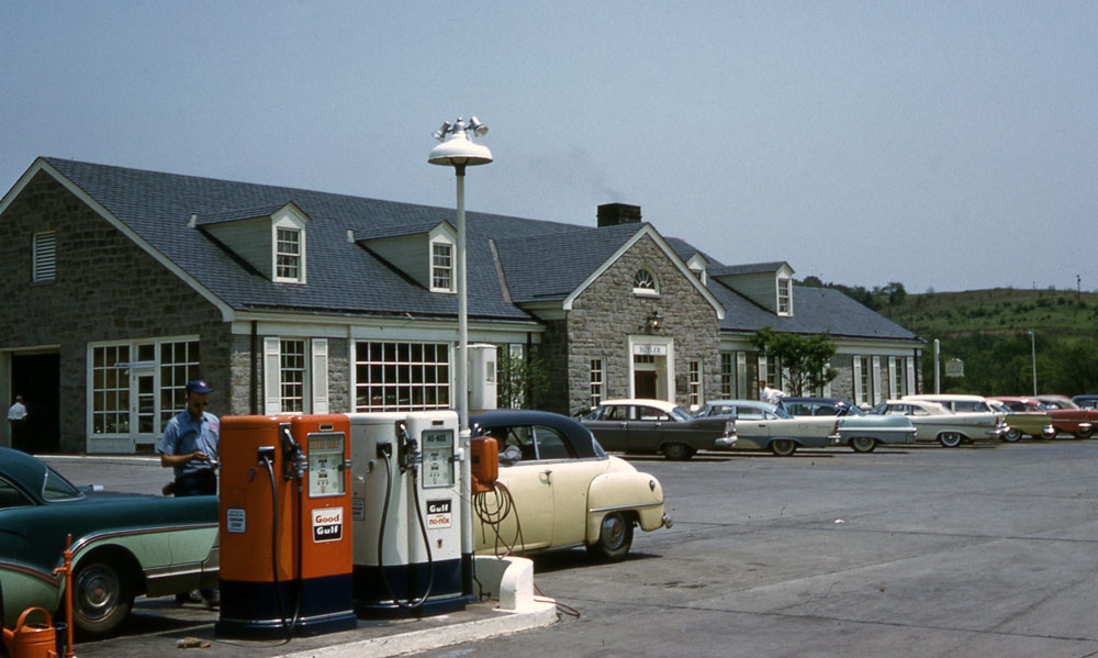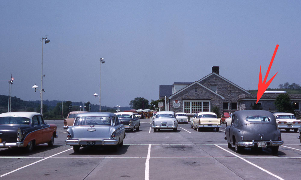 Below are transparencies that Henry took of the Butler Service Plaza (restaurant and filling station) on the Pennsylvania Turnpike (click to enlarge). The arrowed car is Henry’s Standard Vanguard. The Butler Servce Plaza was closed in 2002.