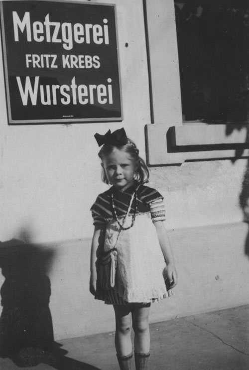The front of the house that Katharina grew up in. The door at the bottom right was the entrance to her father Fritz Krebs’s butcher’s shop, and next to it was the shop window – you can see salami and other meat products hanging in it. Behind the shop was a work room for preparing meat. The other windows on the ground and first floors belonged to rooms that the family lived in. The room under the eaves on the left was where Katharina’s paternal grandmother – the owner of the dog Erlo – lived. An employee lived in the room under the eaves on the right. In the basement of the house were various cool and freezer rooms.